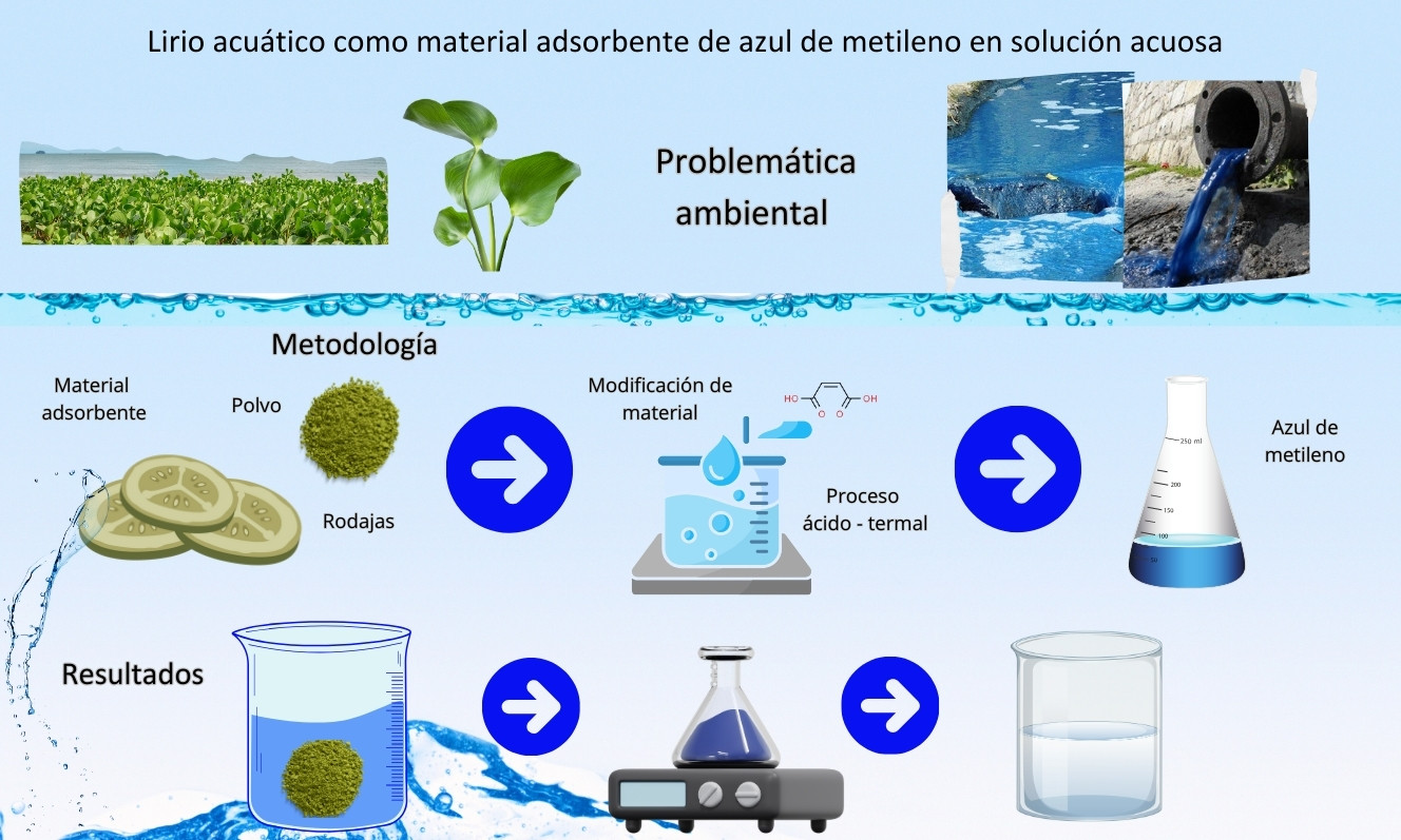 El agua es uno de los recursos naturales más sobreexplotados, parte de su problemática es su contaminación por colorantes producto del teñido en la industria textil, aunado a ello los cuerpos de agua tienen presencia de plantas acuáticas como el Lirio debido a la alta concentración de nutrientes generando eutrofización, por ello este trabajo propone el uso del lirio acuático como bioadsorbente de colorantes presentes en agua. La metodología consistió en la recolección, lavado y secado de lirio acuático, sometiéndolo a un tratamiento químico en presencia de una solución de ácido maléico, con la finalidad de modificar sus propiedades como material adsorbente. Se realizaron cinéticas e isotermas de adsorción con el lirio acuático al natural y modificado las cuales indican que el lirio acuático al natural presenta el 80% de remoción de azul de metileno en un tiempo de quince minutos, mientras que el lirio acuático modificado presenta el 56% de remoción de colorante en el mismo lapso, mostrando que este material funciona como bioadsorbente para la eliminación del colorante azul de metileno.