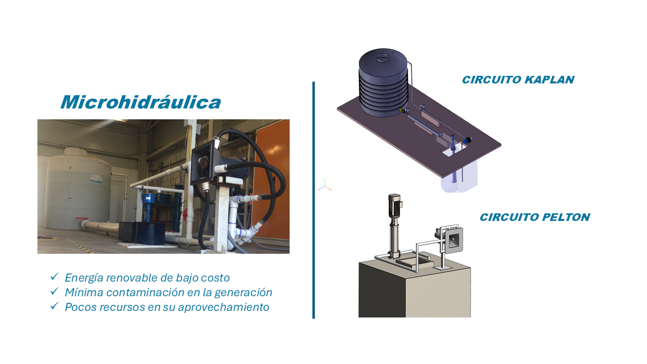 Se describe la implementación de un laboratorio para la demostración y evaluación de turbinas microhidráulicas. La necesidad surge ya que actualmente las turbinas micro hidráulicas son poco empleadas en México siendo la principal causa, los problemas culturales en el uso de agua, la contaminación en ríos donde se podrían implementar, aunado a la falta de conocimiento de los sistemas micro y minihidráulicos, esto aun cuando el 12% de la energía generada en Mexico se genera por la energía hidráulica. El sistema implementado consiste en un circuito cerrado con depósito de 5000 litros, control de caudal, una bomba y un punto de conexión de la microturbina a probar, con generador eléctrico. El circuito instalado muestra el diseño fundamental de la conexión, la impulsión de microturbinas de 100 W del tipo Kaplan y 1200 w tipo Pelton, así como la generación de energía eléctrica de corriente alterna. El arreglo permite probar diferentes diseños de turbina comerciales y no comerciales por lo que se tiene la oportunidad de probar el rendimiento de prototipos funcionales, demostrando las bondades de la implementación de esta tecnología con relación a su costo beneficio.