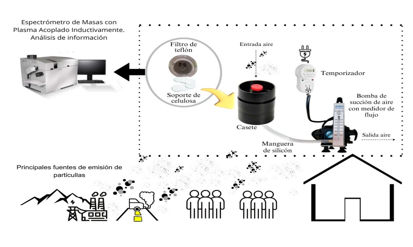 Al año ocurren 6.7 millones de muertes prematuras relacionadas con la contaminación atmosférica mundialmente. Las partículas suspendidas son uno de los contaminantes de mayor interés en la salud, debido a su impacto por tamaño, composición y forma. El uso excesivo de combustibles fósiles para la generación de electricidad y la alta tasa vehicular en la ciudad de La Paz, Baja California Sur, cumple un rol fundamental en la emisión de las partículas. El presente estudio examinó la composición de las partículas suspendidas en el aire de la ciudad de La Paz y sus posibles fuentes de emisión. Desde cuatro sitios de muestreo de 3 m de altura y durante un año se colectaron partículas suspendidas en filtros de teflón utilizando una bomba de succión de aire. Mediante análisis de composición química se identificaron 14 elementos en 96 muestras, destacando el níquel y vanadio por sus altas concentraciones. Los análisis estadísticos indican que los elementos se emiten por tres grupos de fuentes: natural; autos, pinturas, huella de plomo; centrales eléctricas. Las concentraciones de los elementos se incrementan durante el invierno debido a la disminución de la temperatura, inversiones térmicas y vientos estacionales. Estos hallazgos destacan su importancia para la salud pública.