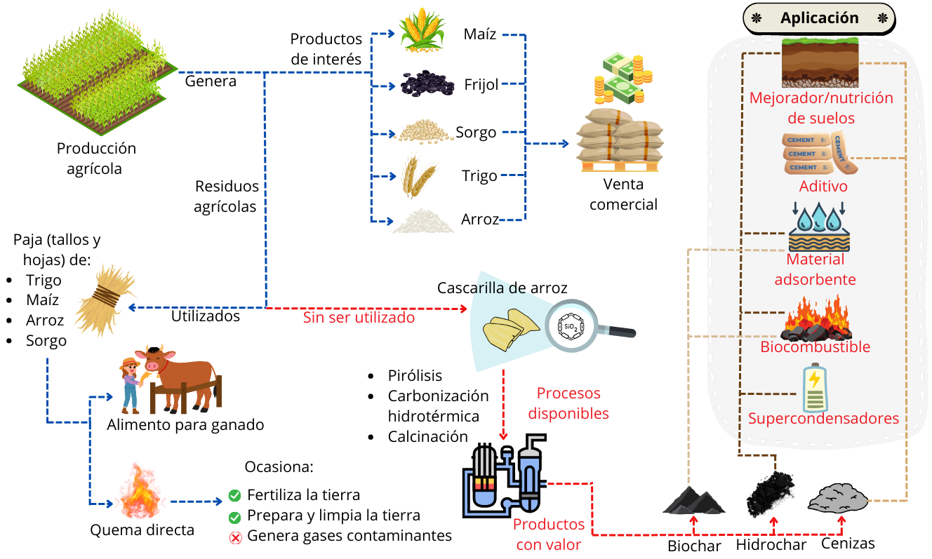 Las actividades agrícolas generan grandes cantidades de residuos y dependiendo de su composición química es el nivel de impacto que pueden provocar, por ejemplo, los residuos orgánicos contribuyen a la generación de gases contaminante. Hablando específicamente de la cascarilla de arroz, presenta una limitante la cual es su elevado contenido de sílice, sin embargo, a su vez es un área de oportunidad para ser aprovechada. El objetivo del presente trabajo es demostrar las distintas aplicaciones que tiene la cascarilla de arroz para su aprovechamiento. Debido a su composición química, la cascarilla de arroz puede someterse a diferentes procesos, uno de ellos es la carbonización hidrotérmica. Mediante este proceso se produce hidrochar, agua de proceso y gas de síntesis, estos productos tienen distintas aplicaciones, de las cuales, una de ellas es su uso como bioenergéticos. Un parámetro que evaluar entre los productos de la carbonización es el poder calorífico. El poder calorífico que contiene el hidrochar es superior al del agua de proceso. De esta manera, un residuo puede tener una aplicación sostenible y adquiere un valor agregado junto con un beneficio ambiental, debido a que se aprovecha un residuo y a su vez, se sustituyen combustibles provenientes de productos fósiles.
