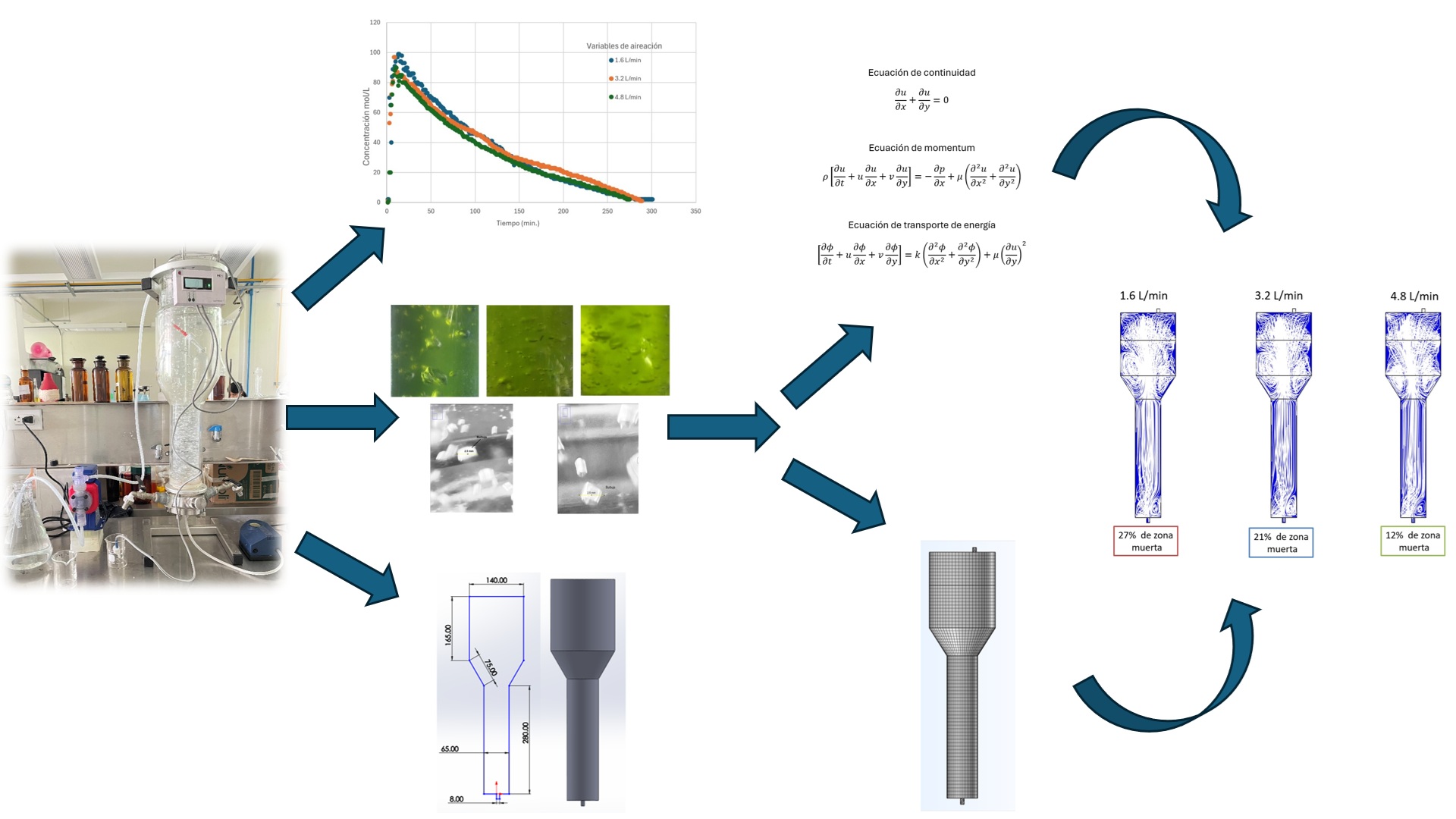 En la ingeniería Química se encuentra la rama de diseño de reactores, la cual se encarga de modelar simular y optimizar. Sin embargo, en la realidad se observan comportamientos muy diferentes a los modelos ideales, esto debido a una deficiente agitación generando zonas muertas o estáncadas por lo que es importante estudiar y evaluar estos comportamientos y una de las formas es mediante la distribución de tiempos de residencia y CFD. El objetivo de este trabajo es evaluar tres diferentes aireaciones (1.6, 3.2 y 4.8 L/min) las cuales por medio de burbujeo generan la agitación en un biorreactor Applikon. Para ello se utilizó un trazador (NaCl) con una concentración de 1 molar, del cual se inyectan 5 ml con el método de pulso e inmediatamente es monitoreado con un medidor digital. La distribución de tiempos de residencia mostró en la aireación de 1.6 y 3.2 L/min gran cantidad de picos indicando cortos circuitos a comparación a la de 4.8 L/min, obteniendo un mezclado más homogéneo con respecto al tiempo. Esto igual se observó en los porcentajes de zonas muertas obtenidas en la simulación CFD, las cuales fueron 27 % en 1.6 L/min, 21 % en 3.2 L/min y 12 % para 4.8 L/min.Citas