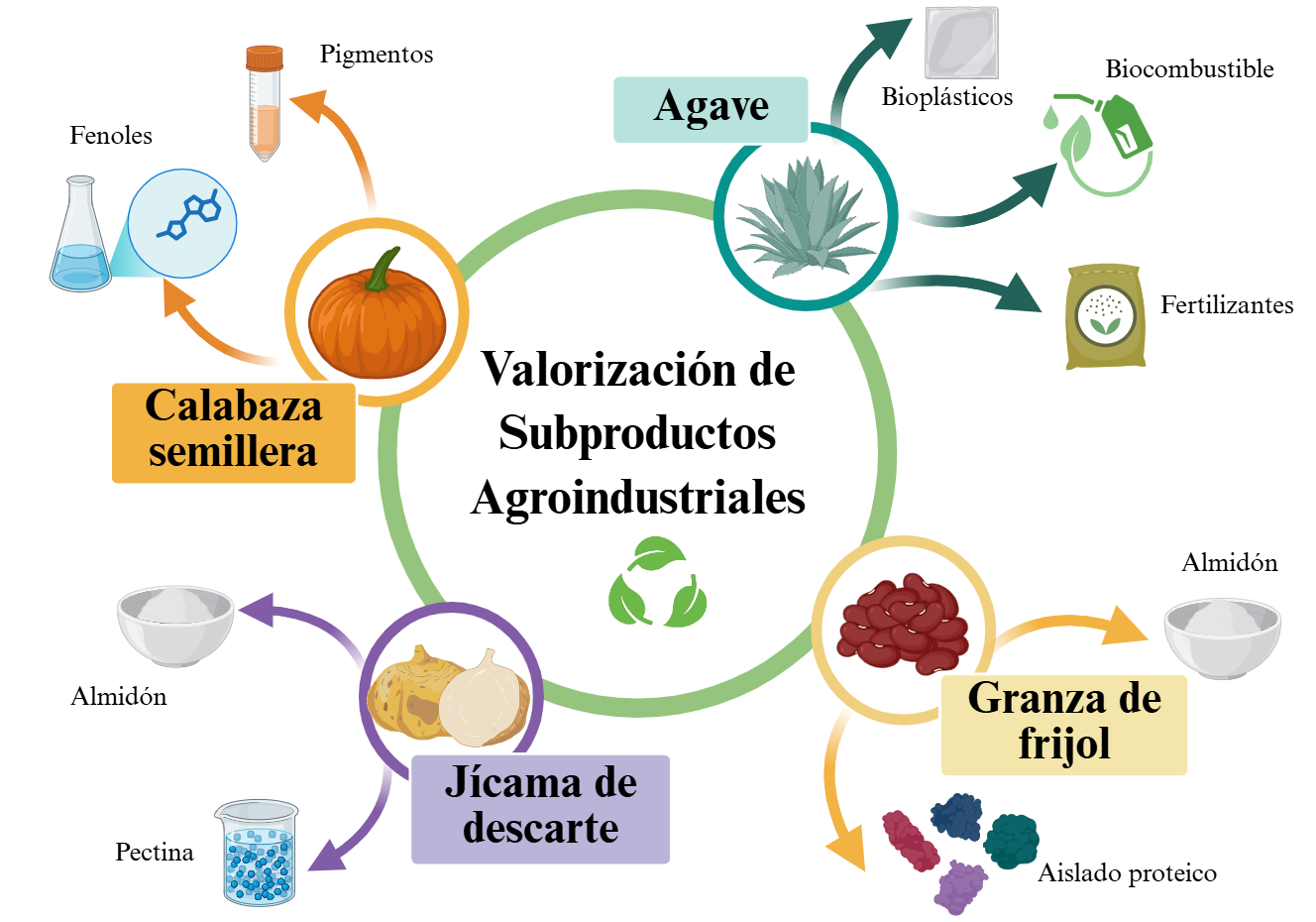 En nuestro país, diariamente se desperdician cientos de alimentos a lo largo de la cadena de suministro, desde la cosecha hasta el procesamiento convirtiéndose en residuos que, en su mayoría se consideran materiales sin valor. Los residuos suelen terminar en la basura, vertederos, rellenos sanitarios o como alimento para ganado sin recibir un tratamiento adecuado. Estas prácticas representan un problema para la sostenibilidad económica, medio ambiental y social en todo el país, lo que hace urgente encontrar alternativas para evitar este desperdicio de recursos. La comunidad académica y científica ha enfocado esfuerzos en agregar valor a estos alimentos descartados, incluyendo a los subproductos agroindustriales generados durante el procesamiento de los alimentos, para que se conviertan en materia prima de otro proceso, aplicando el concepto de bioeconomía circular. De esta manera, el presente artículo ofrece un panorama de alternativas sustentables para valorizar residuos agroindustriales desde la ciencia y la tecnología, provenientes del agave, jícama de descarte, granza de frijol y restos de la calabaza semillera, ejemplificando estrategias para transformar los residuos en recursos de valor, contribuyendo a reducir el impacto ambiental, disminuir el volumen de residuos y fomentar modelos de producción más responsables.