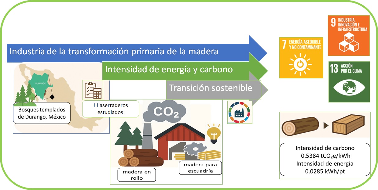 El presente artículo esboza el proceso de transformación de madera en rollo en madera para escuadría y analiza el impacto ambiental que representa el aprovechamiento forestal maderable en la región de El Salto, Durango, mediante la estimación de dos indicadores clave de sustentabilidad: la intensidad de energía y carbono. Para ello, se realizó una auditoría energética en 11 aserraderos mediante visitas técnicas y análisis de consumo energético, con base en la metodología de la American Society of Heating, Refrigerating and Air-Conditioning Engineers (ASHRAE). Los resultados muestran amplias variaciones en la eficiencia de transformación entre aserraderos. El mayor consumo de energía mensual entre los aserraderos evaluados fue de 27,532.23 kWh, lo que equivale a generar 9.99 tCO₂e. Intensidades de carbono menores (0.36) tCO₂e/kWh), sugieren una mayor eficiencia energética del proceso. En contraste, una intensidad de carbono elevada (0.54 tCO₂e/kWh), implica ineficiencias en el uso de energía. Así que intensidades energéticas bajas (0.03 kWh/pt) son deseables desde una perspectiva de sustentabilidad. La evaluación de estos indicadores permite a la industria de la madera establecer metas energéticas a través del monitoreo continuo y orientar sus esfuerzos hacia modelos de producción alineados con los Objetivos de Desarrollo Sostenible.